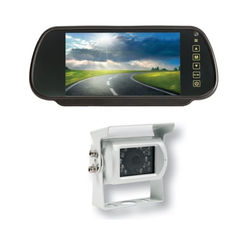 Caméra de recul compacte avec son écran conçu pour être installé sur votre rétroviseur à l’intérieur de votre camping-car ou de votre fourgon aménagé.