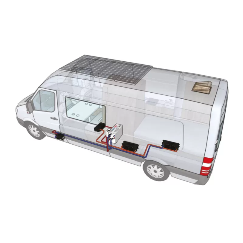 Les systèmes de chauffage hydroniques sont conçus pour offrir un confort optimal et une chaleur agréable. Dans ces types de chauffage, la chaleur est transmise à l’aide d’un liquide caloporteur (ici, une solution de glycol) circulant à travers un système de tuyauterie fermé vers des échangeurs de chaleur. Ces échangeurs libèrent ensuite l’air chaud dans l’espace de vie de votre fourgon aménagé ou camping-car.