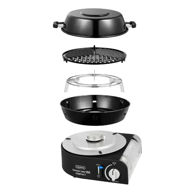 Barbecue au gaz compact de la marque CADAC, le Safari Chef 30 Compact Lite est un appareil de cuisson avec plusieurs surfaces de cuisson pour cuisiner simplement et rapidement en extérieur.