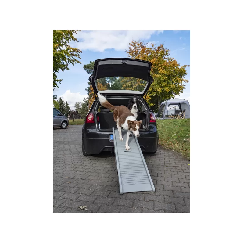 La rampe Emma de chez CAMP4 est un accessoire pliable et compact qui se dispose dans votre coffre ou dans votre hayon de van pour faciliter la descente de votre chien vers l’extérieur.