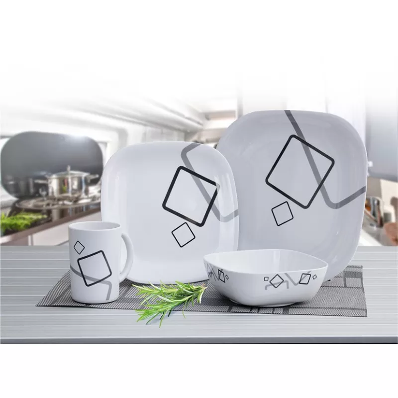 Lot de vaisselle en mélamine au design moderne, très résistante et spécialement conçu pour une utilisation en bateau, camping-car ou caravane.