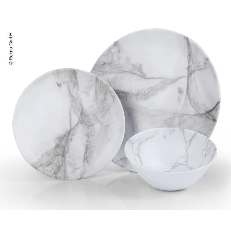 Le set vaisselle Marmor de CAMP4 se compose de 6 pièces fabriquées en mélamine au design moderne imitation marbre pour le camping, camping-car et bateau. Idéal pour 2.