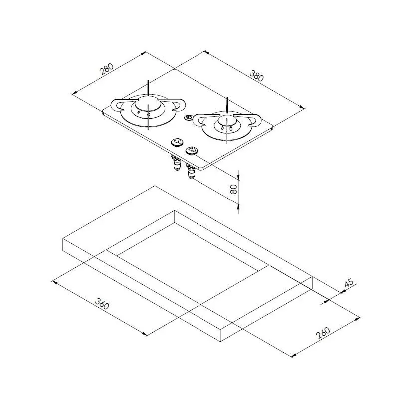 – Dimensions d’encastrement : L 360 x l 260 x P 80 mm