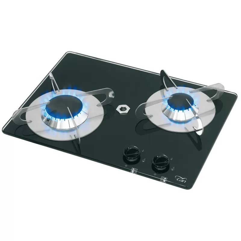 CAN Burny Cristal 2 feux est un réchaud/plaque de cuisson à gaz avec plan en verre-trempé pour cuisine de camping-car ou bateau.