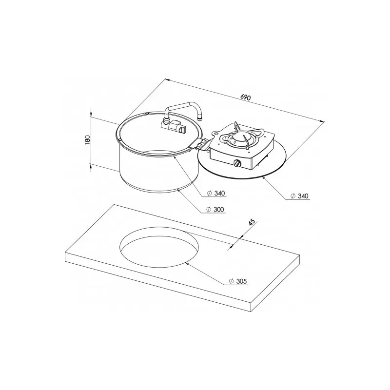 - Dimension évier : Evier rond, profondeur 180 mm ø externe 3000 mm