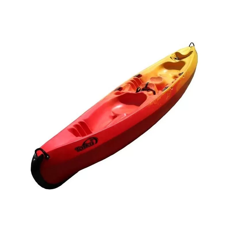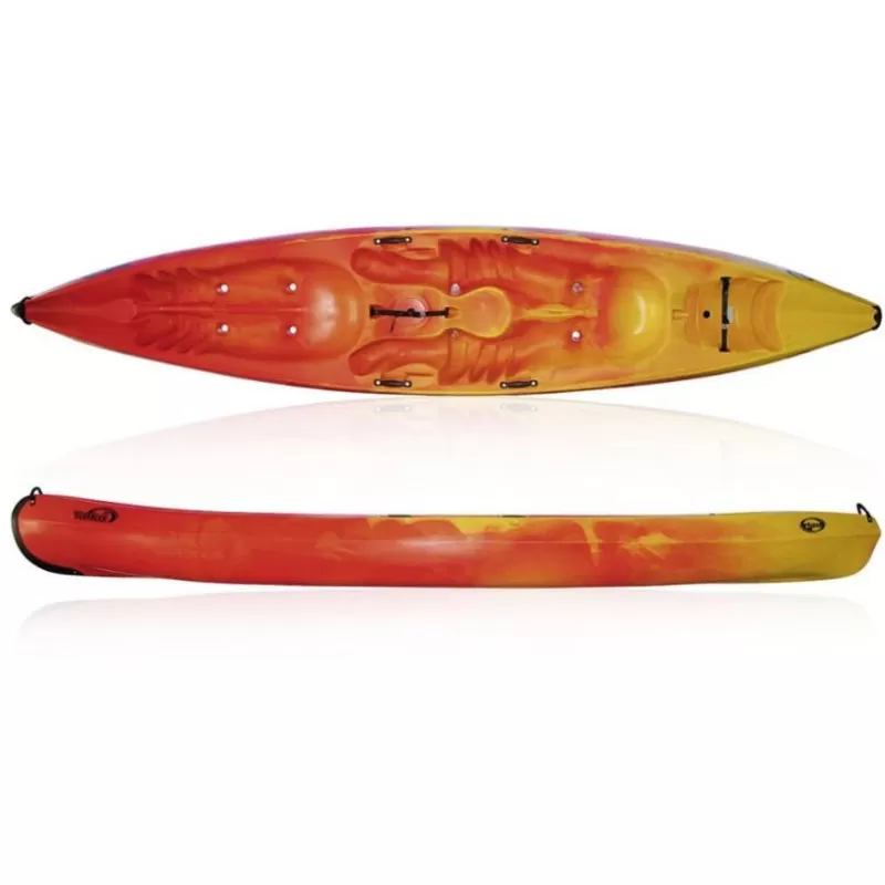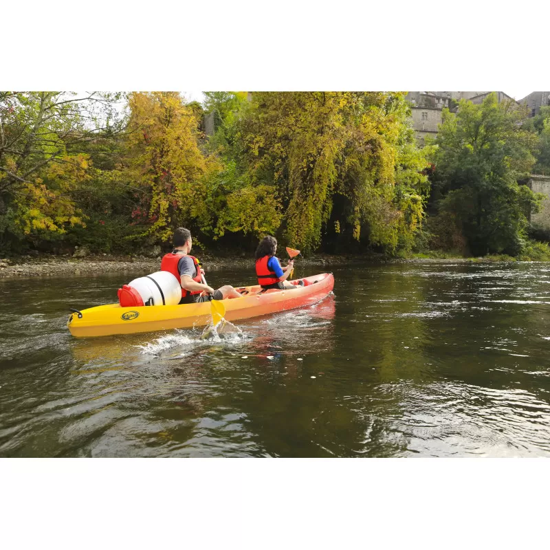 Le kayak 2 à 3 place de location par excellence, ultra robuste, tous gabarits, ne crains pas les zones peux profondes avec bidon se transformant en dossier grâce au support incliné.
