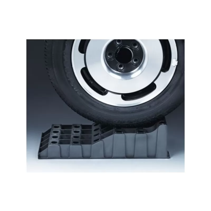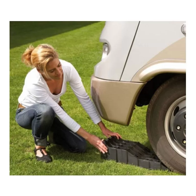 Pour une accroche parfaite, le jeu de cales roues FROLI Multi-Cale 10T est compatible avec la rampes d’accès FROLI pour une adhérence parfaite du pneu du camping-car à la cale de confort FROLI.