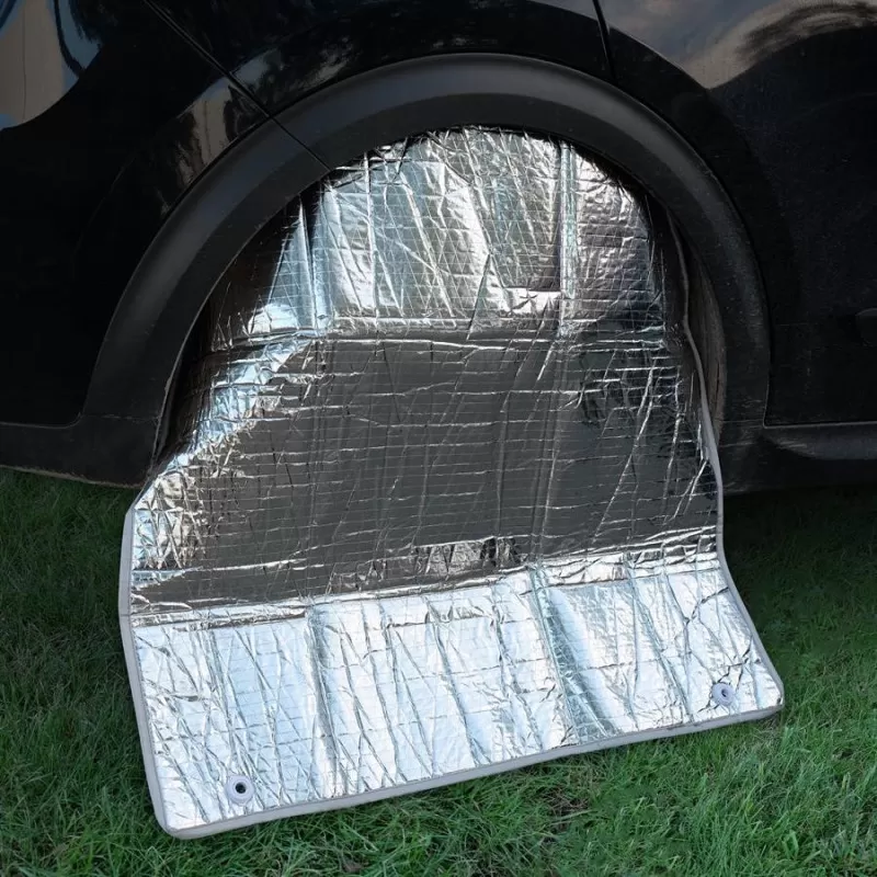 Housse de protection pour les roues de camping-car, de caravane ou de fourgon aménagé, la Mugello est fabriquée à base de mousse EVA et d’aluminium, elle permettra ainsi de réfléchir les rayons UV et la chaleur pour une protection optimale. La housse de roue HABA évitera à vos pneus de craqueler sous l’effet des intempéries été comme hiver, il est donc fortement conseillé d’en utiliser lors de l’hivernage de votre véhicule mais aussi lors de stationnements prolongés.