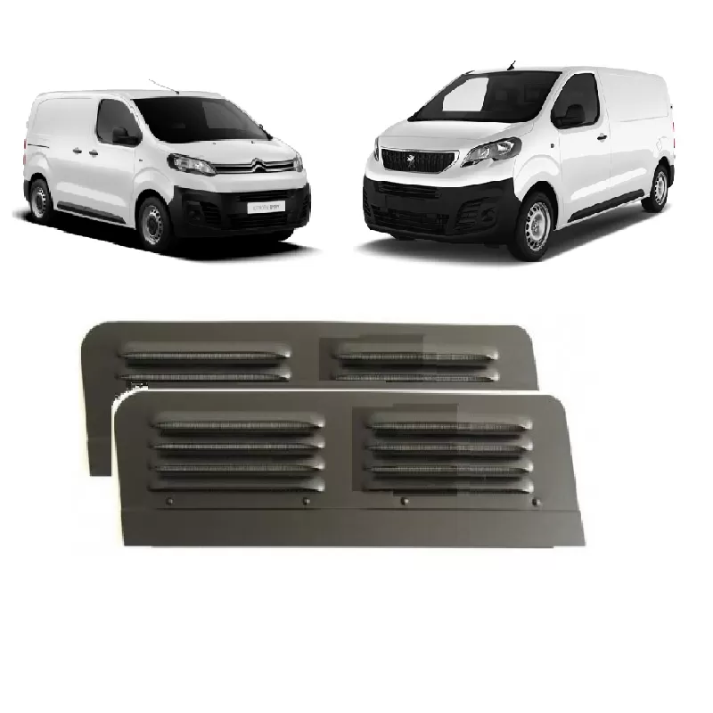 Paire de grille de ventilation à poser sur les fenêtres latérales avant des fourgons aménagés Citroen Jumpy et Peugeot Expert. Permet de ventiler l’intérieur en sécurité.