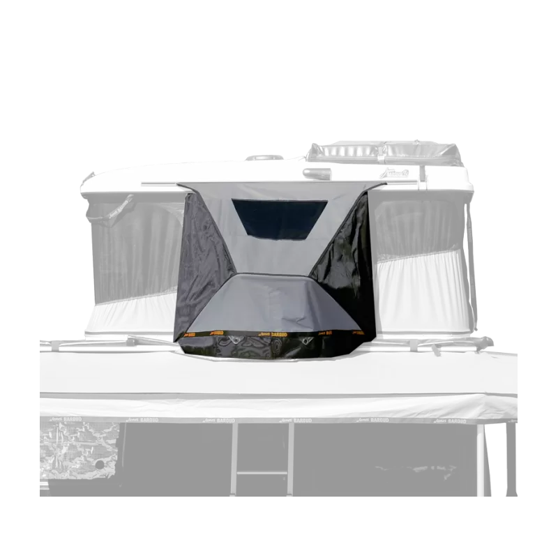 Tunnel de la marque JAMES BAROUD, cet accessoire optionnel est idéal pour faire un sas entre l’extérieur et l’intérieur de votre tente de toit, posée sur votre van aménagé.