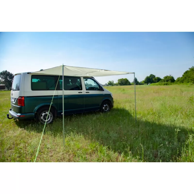 Le Charly de REIMO est une toile d’ombrage, un auvent léger pour les fourgons et vans aménagés en camping-car ou caravane. Facile à installer, il fait 255 x 240 cm et fait office de solette un fois en place.