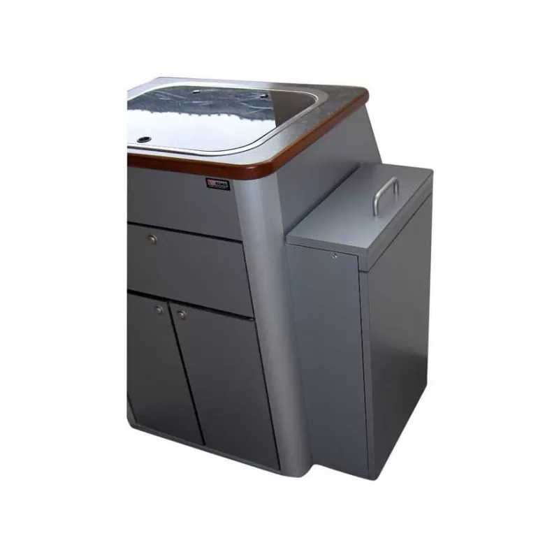 Le meuble de cuisine REIMO est fourni avec son évier intégré avec plan de travail en verre, un grand placard double battant et un tiroir de rangement pour vos couverts et autres ustensiles de cuisine ainsi qu’un support pliable pour réchaud à disposer à droite du meuble dans votre VW T5.