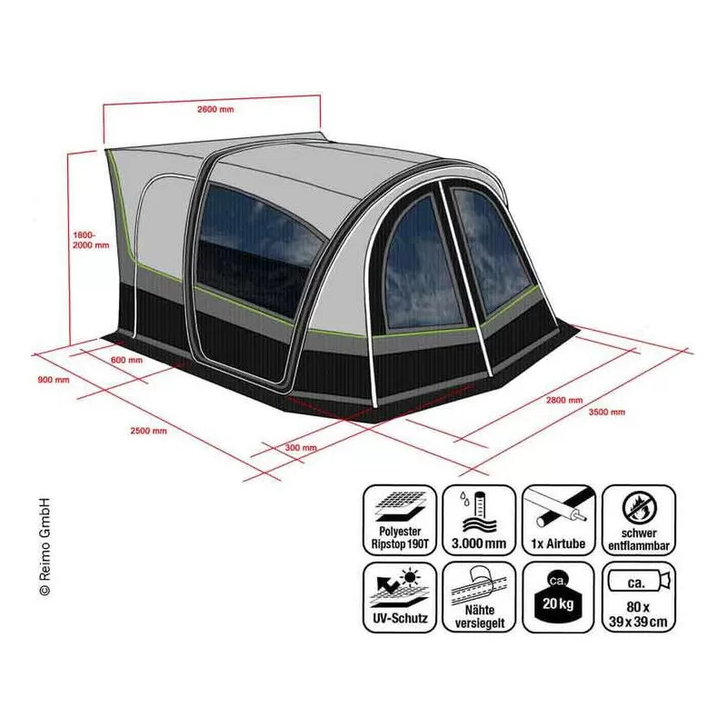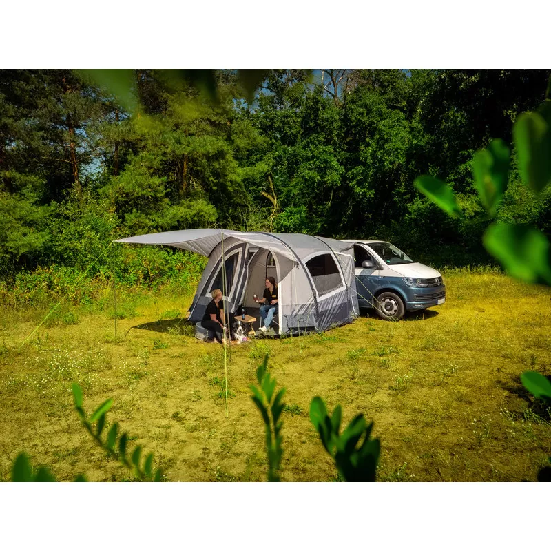 Le Tour Van Air de REIMO est un auvent latéral pour fourgon & van aménagé avec une structure gonflable rapide à mettre en place ! Avec ses dimensions au sol de 340 x 350 cm, il peut accueillir une chambre à coucher en option.