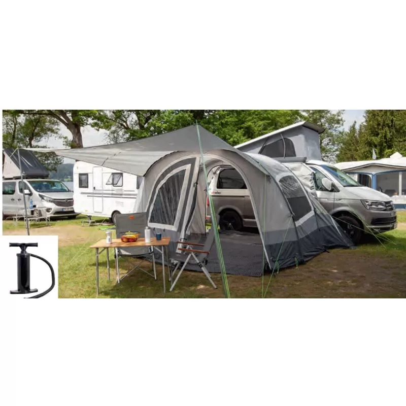 Développé pour augmenter l’espace de vie, cet auvent offre l’avantage de se monter rapidement grâce à sa structure gonflable. Une fois en place, il offre une surface « habitable » de 250 cm de profondeur sur 350 cm de long sans compter le sas de 90 cm venant faire le lien entre la porte latérale et le auvent.