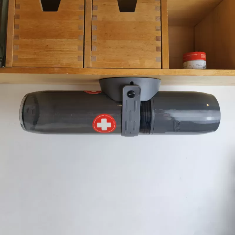 Fixation du socle sur un mur, sous une étagère, ou encore tout simplement posé sur le plan de travail : RODOL’F le Secouriste peut être accroché via la sangle en caoutchouc, ou clipsé.