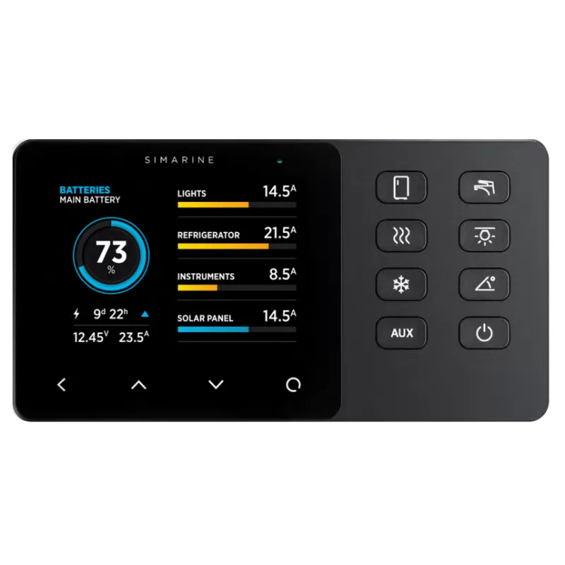 Pour la batterie auxiliaire, un contrôleur de batterie est justement intégré à la central électrique ! Que vous soyez en batterie AGM, GEL ou Lithium, le Simarine SCP100 pourra afficher avec exactitude le pourcentage d’énergie restante dans la batterie auxiliaire.
