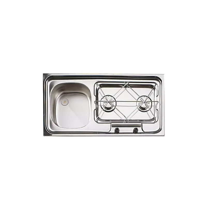 Modèle de combiné plan de cuisson en inox avec 2 réchauds gaz et évier, accessoire idéal pour gagner de la place dans la cuisine des camping-cars et fourgons aménagés.