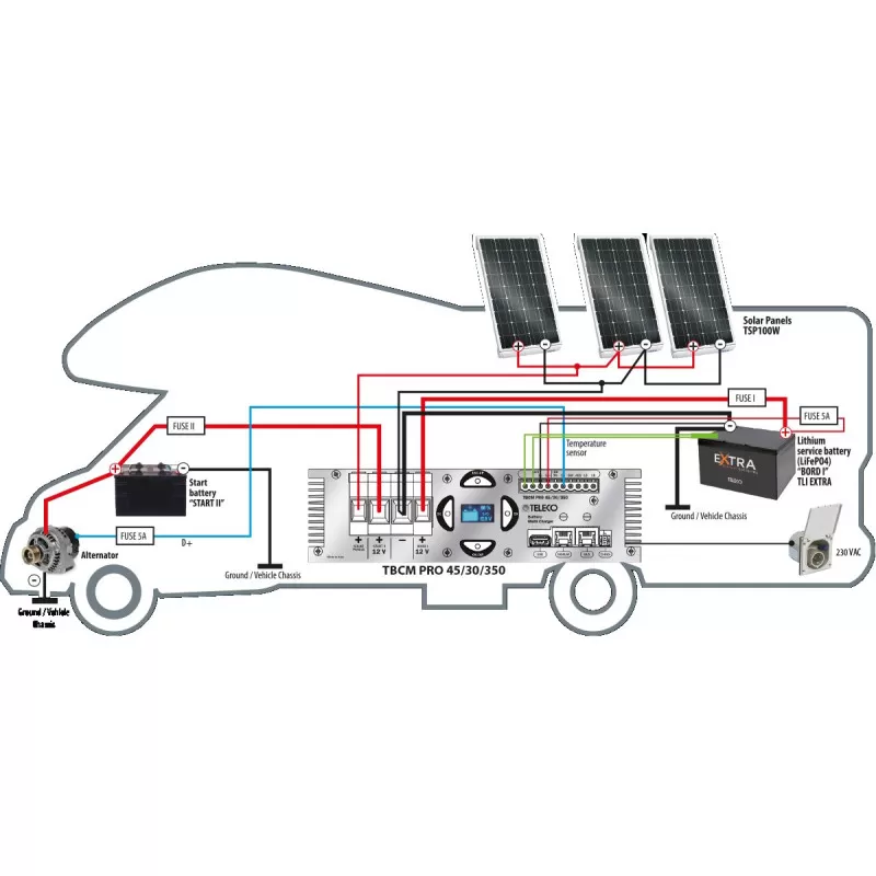 Lorsque vous êtes à l’arrêt, c’est les panneaux solaires 12V qui prennent le relais. Le TBCM PRO 45/30/350 Multicharger intègre un régulateur MPPT pouvant accepté une puissance de panneau de 350 W !