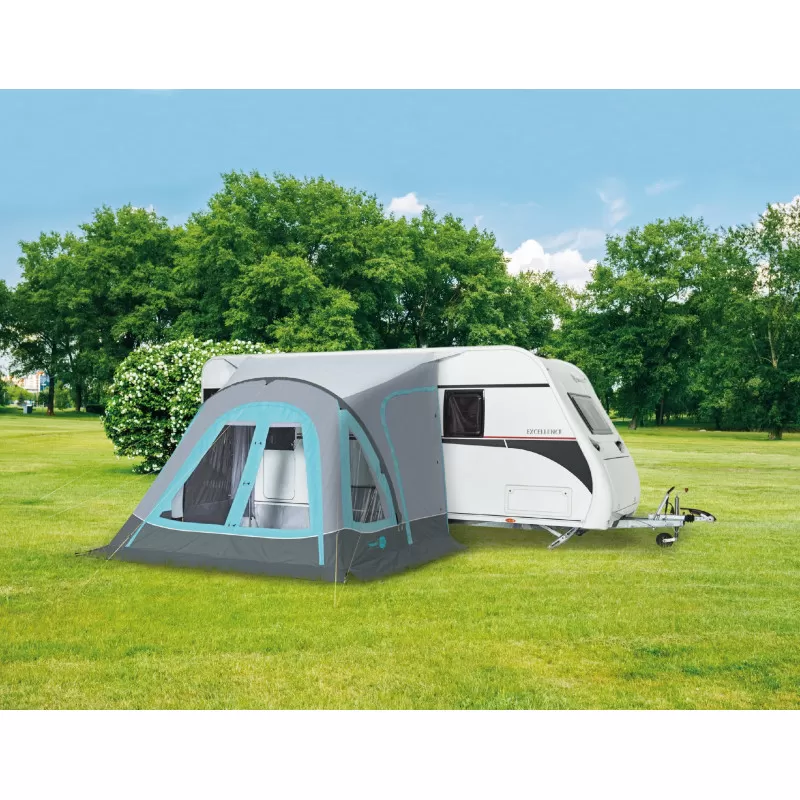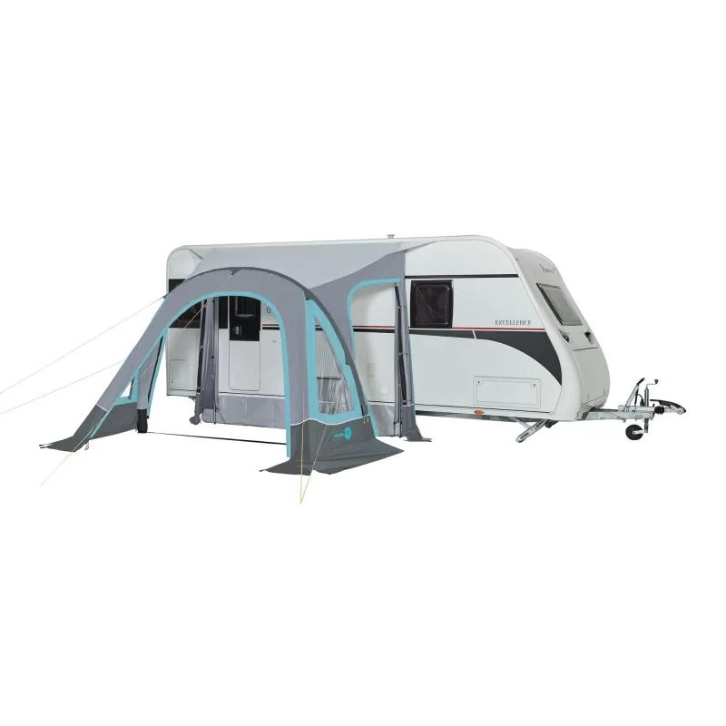 Auvent compact et rapide à monter grâce à son arceau gonflable adapté aux caravanes rigides disposant d’une longueur en façade de 3,50 m.