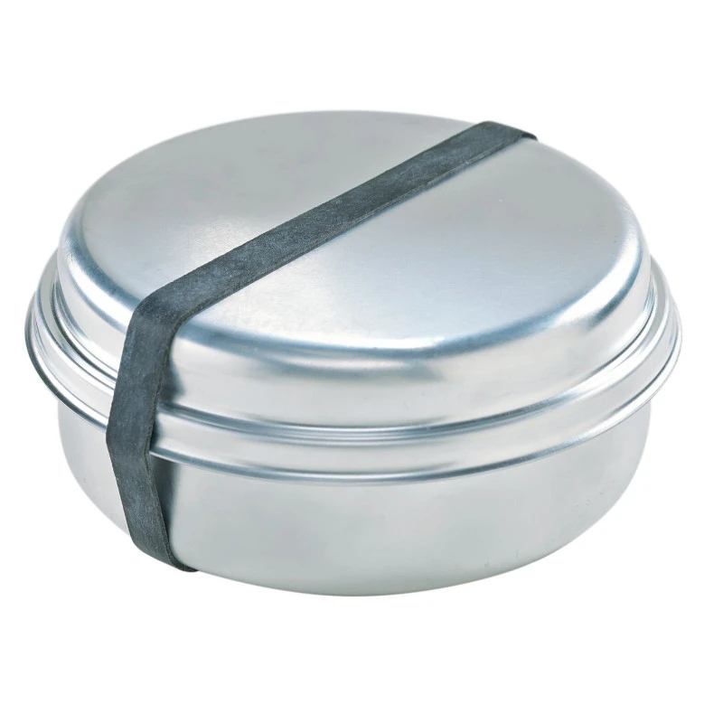 Popote en aluminium conçue pour 2 personnes comprenant divers ustensiles de cuisine adaptés à la cuisine en camping.